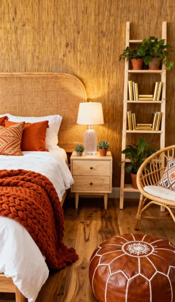 Ready for a tropical vacation vibe? This room feels like a warm, sun-drenched escape! The woven bamboo wall treatment is a brilliant, bold feature. The cane headboard and rattan chair introduce fantastic texture, while the pops of burnt orange in the knit blanket and throw pillows add vibrant warmth. Don’t miss that gorgeous leather pouf—it’s such a quintessential boho accent. The layered plants and golden books on the ladder shelf complete this energetic, eclectic look.