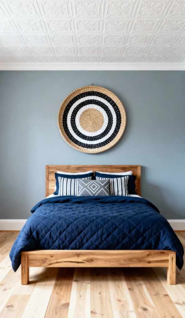 What a refreshing, balanced room! The light, natural wood bed frame and flooring ground the space, while the pale blue-gray walls keep the feeling bright and airy. The focus is definitely on the deep navy quilted duvet, giving the room a crisp, tailored feel. The pillows add a nice mix of stripes and geometric patterns. Above the bed, the large woven wall hanging serves as an incredible piece of statement art, bringing in a fantastic natural texture. It’s chic and calming!