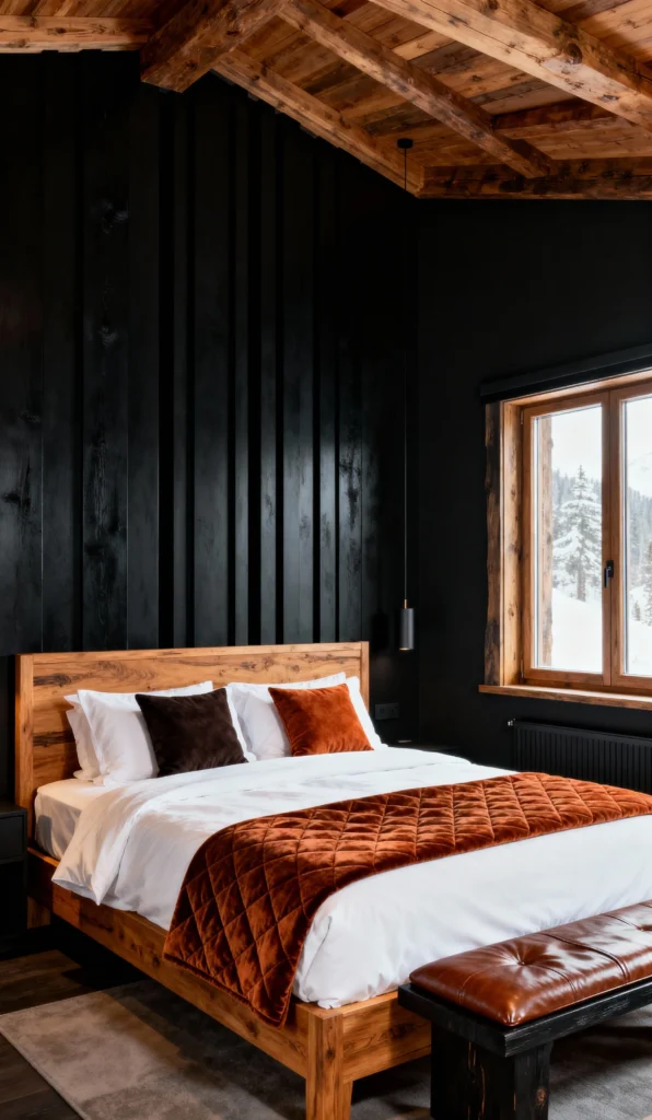 This is the ultimate cozy retreat! The dark, almost-black paneling on the walls contrasts dramatically with the exposed natural wood ceiling and window trim. That warm, rich wood bed frame is incredibly inviting. The bedding keeps it clean with white sheets, but the deep, quilted rust/orange throw and velvet accent pillows add a layer of warmth and luxury. The window view of a snowy landscape seals the deal—it feels like a high-end ski lodge.