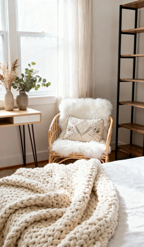 Ah, the pure calm of this space! This corner of the room is so light and bright, thanks to the sheer curtains and large window. It embodies Hygge (Danish for a quality of cozy contentment) perfectly. The focus here is on soft textures: a beautiful, chunky cream knit throw (similar to the one in 10.jpg but lighter), a cozy rattan chair, and multiple sheepskin/fur cushions. It’s a clean, simple look that emphasizes comfort and natural light—the perfect reading nook!