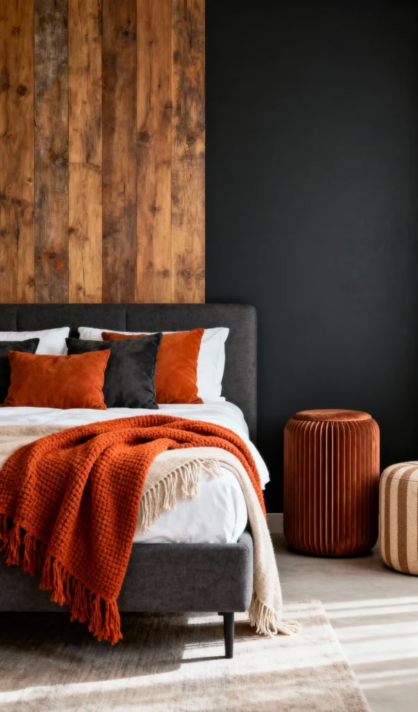 Here’s a masterclass in mixing warm woods and modern edges. The striking black wall is met with a vertical panel of natural wood, creating a stunning backdrop for the bed. The low-profile upholstered gray bed keeps the feel sleek and contemporary. Against this neutral canvas, the deep terracotta-colored throw and cushions are absolutely vibrant. The pleated, cylindrical ottoman adds a unique, sculptural element. It’s a stylish and sophisticated urban look.