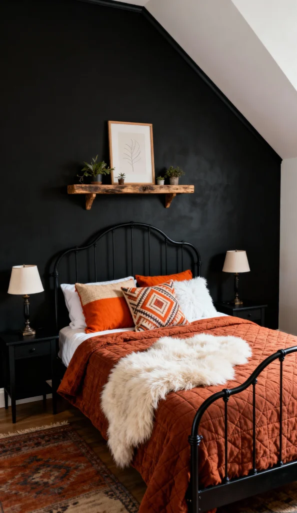 This is a fantastic example of using dark colors for a cozy, sophisticated feel. The entire back wall is painted a striking matte black, which beautifully highlights the textures and colors on the bed. The black metal bed frame blends into the wall, letting the fiery orange and earthy red bedding stand out. The contrast of the white fluffy throw and the light wood shelf with simple art prevents the dark walls from feeling too heavy. It’s chic and welcoming all at once.