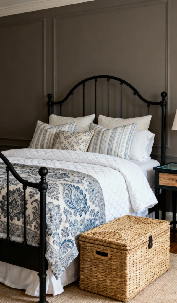 This room is giving us elegance and a touch of European charm! The dark, almost charcoal wall color with the subtle wall molding is so sophisticated. The black metal bed is back, but this time it’s draped in crisp white bedding layered with a beautiful blue and white patterned quilt and striped pillows. It has a gorgeous, vintage feel without being stuffy. I especially love the large, woven wicker trunk at the foot of the bed—it’s a perfect blend of form and function for storage.