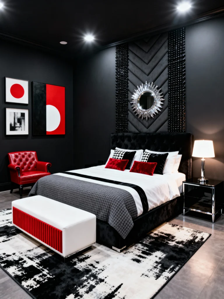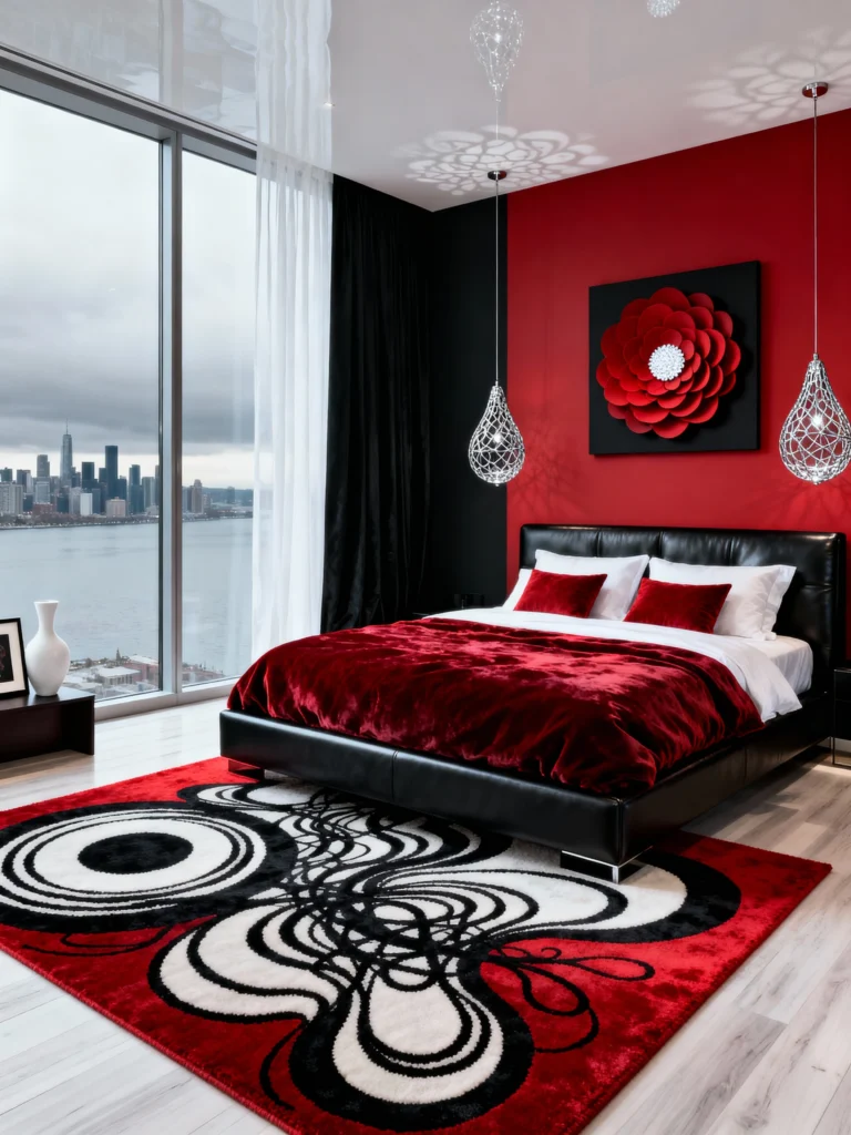 Final stop! This room is all about sharp lines and graphic patterns. That rug with the black and red chevrons is incredible. The red glow from the recessed ceiling light gives the whole space a warm, atmospheric vibe. I also really like the mix of the black-and-white abstract painting with the fiery red one on the adjacent wall. It feels like a modern art gallery you can actually sleep in. Very sleek, very powerful.