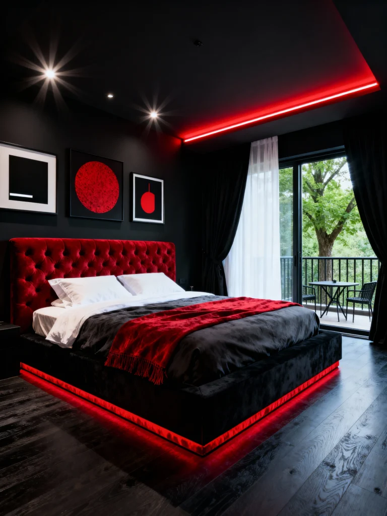 This is definitely the “cool kid” of the bunch. The under-bed LED lighting gives off major futuristic, gamer, or high-end lounge vibes. The velvet tufted headboard in that bright ruby red is incredibly striking against the pitch-black walls. It’s a very moody, dark space, but the clever use of lighting—both the neon strips and the ceiling spotlights—ensures it doesn’t feel like a cave. It’s edgy, modern, and very cinematic.