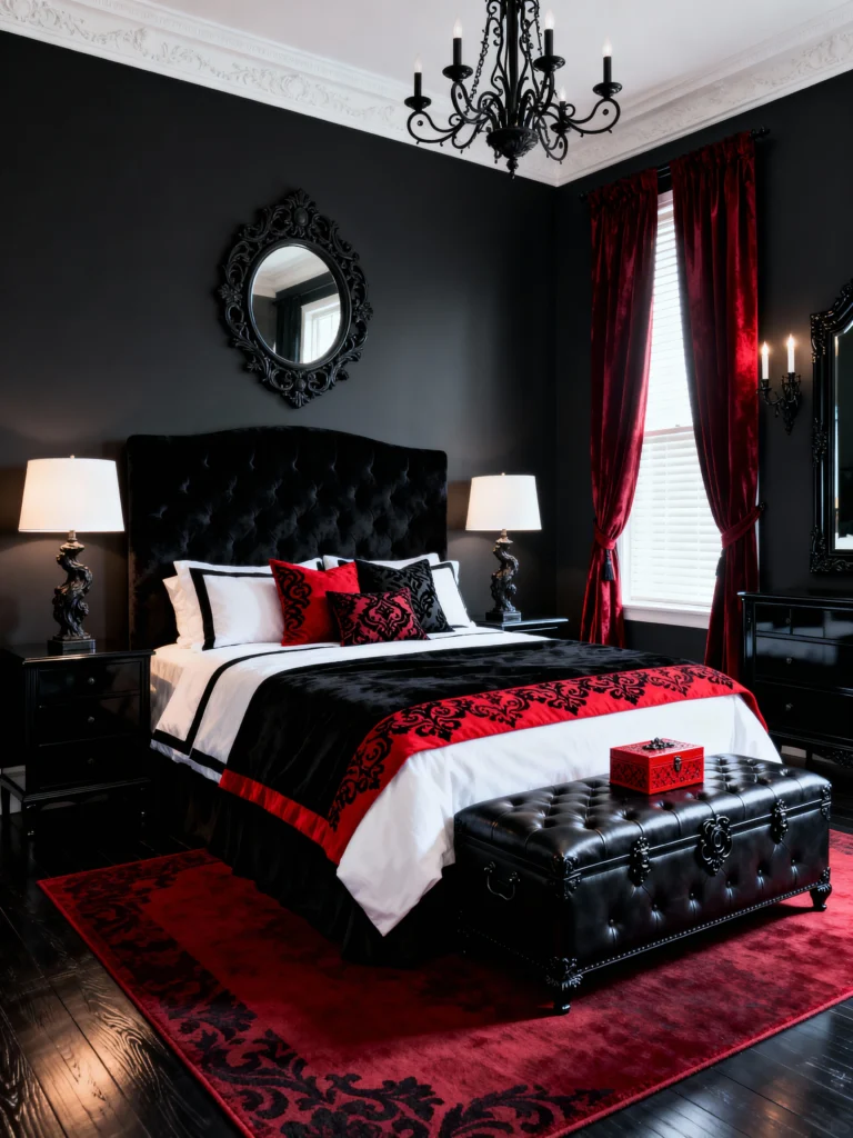 Looking for something a bit more traditional? This room leans into those classic Gothic elements. The ornate black mirror and the chandelier are stunning, and the damask pattern on the bedding adds a layer of sophistication. I love the addition of the black leather trunk at the foot of the bed; it’s practical but also fits the aesthetic perfectly. The heavy red curtains give the whole room a dramatic, theatrical feel. It’s timeless and very bold.