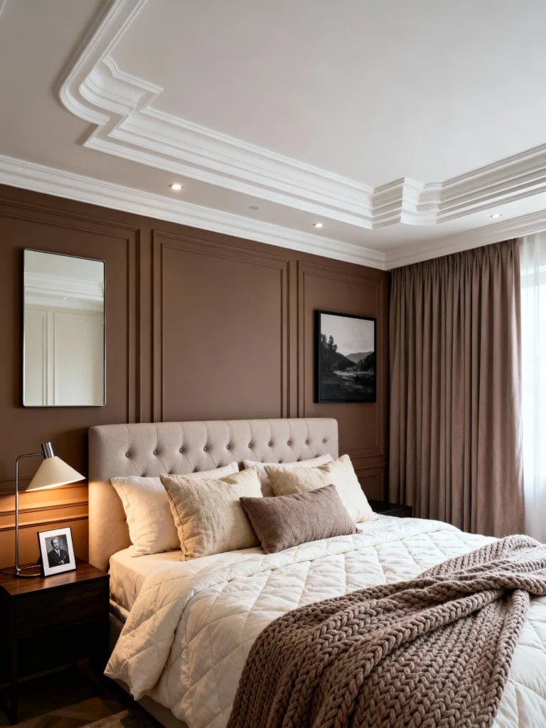 If you want to feel like you’re waking up in the heart of France, this is it. The deep cocoa-brown paneled walls create such a cozy, sophisticated “hug” for the room. I’m obsessed with how that crisp white crown molding pops against the dark walls—it’s pure elegance. The tufted headboard and chunky knit throw add just enough texture to keep it from feeling too stiff. It’s the perfect blend of moody, masculine tones and soft, romantic details.