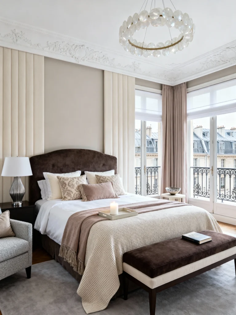 Talk about a “wow” factor! That shell-inspired chandelier is a total showstopper. This room leans into a soft, monochromatic palette of taupe and cream, but it uses different fabrics—like the velvet headboard and the waffle-knit blanket—to keep things interesting. The vertical wall panels behind the bed add a lot of height, making the whole space feel grander. It’s very high-end hotel suite, don’t you think?