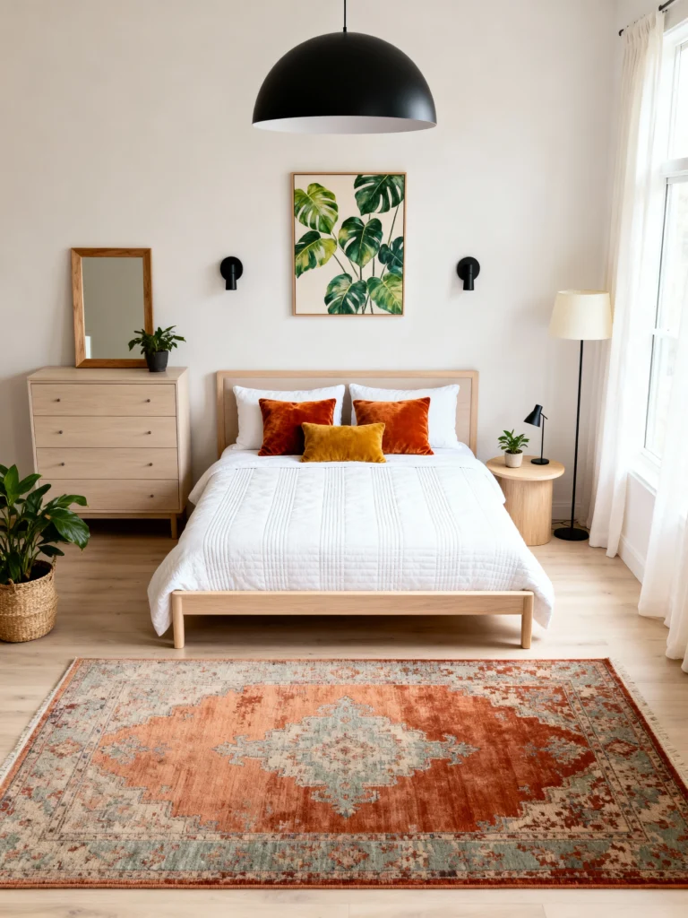 This room is all about those warm, earthy vibes. Those rust-colored pillows are the stars of the show here! Notice how they play off the orange woven bench at the foot of the bed? It’s such a smart way to tie the room together. The macramé wall hanging and that oversized arched mirror give it a bit of a “global traveler” feel. It’s lived-in, comfortable, and looks like the perfect spot to spend a Sunday morning with a cup of coffee.