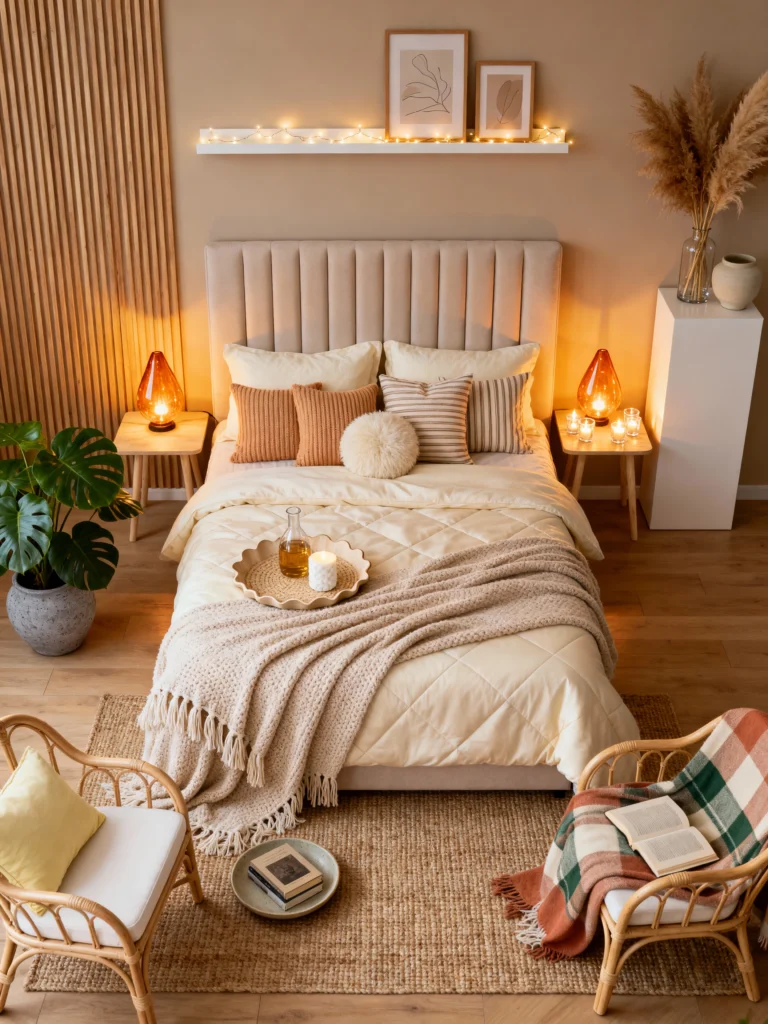 This might be the ultimate “cozy” setup. Between the fairy lights on the shelf and the amber-tinted bedside lamps, the lighting is just magical. The warm wood slats on the wall add a cool mid-century touch, while the layers of blankets and pillows make you want to jump right in. It’s proof that small details, like a tray for your tea and a fuzzy round pillow, can make a space feel like a sanctuary.