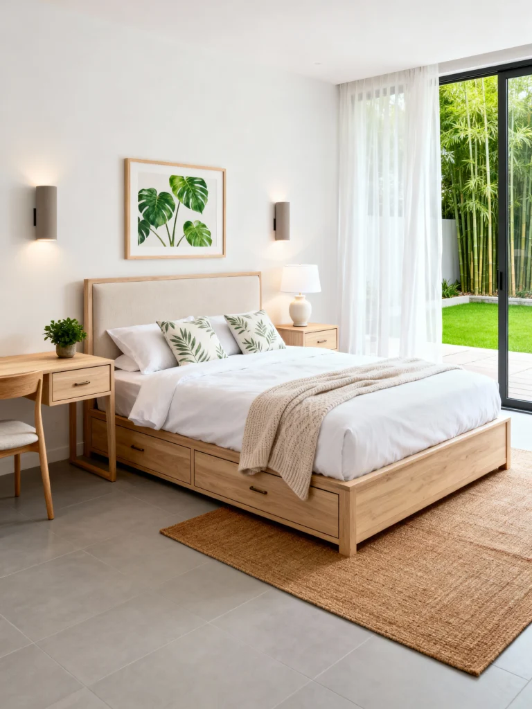 This room feels like a deep breath. It’s very “Scandi-cool” with its built-in storage drawers and clean lines. The connection to the outdoors is what really makes it, though—that floor-to-ceiling glass door letting in the view of the bamboo garden is a dream. The styling is kept simple with sage green leaf-print pillows that echo the greenery outside. It’s organized, peaceful, and totally functional.