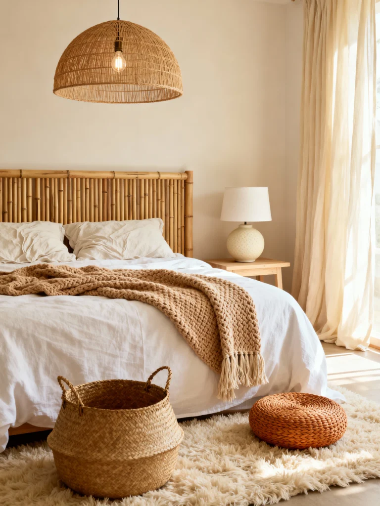 Bring the vacation home! That bamboo headboard and the huge woven basket light fixture give off major tropical resort vibes. Everything feels very tactile here, from the shaggy rug to the chunky knit blanket. It’s a very laid-back, “no shoes allowed” kind of room. If you want your bedroom to feel like a permanent getaway, this is the blueprint to follow.