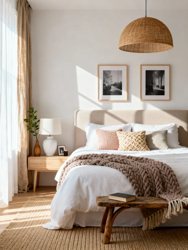 There is nothing like natural light to make a room look expensive. This space is a masterclass in “Quiet Luxury.” The neutral upholstered headboard and the oversized wicker pendant light create a soft, organic feel. That chunky, oversized knit throw adds a massive dose of texture without needing loud colors. It’s simple, effortless, and looks incredibly high-quality.