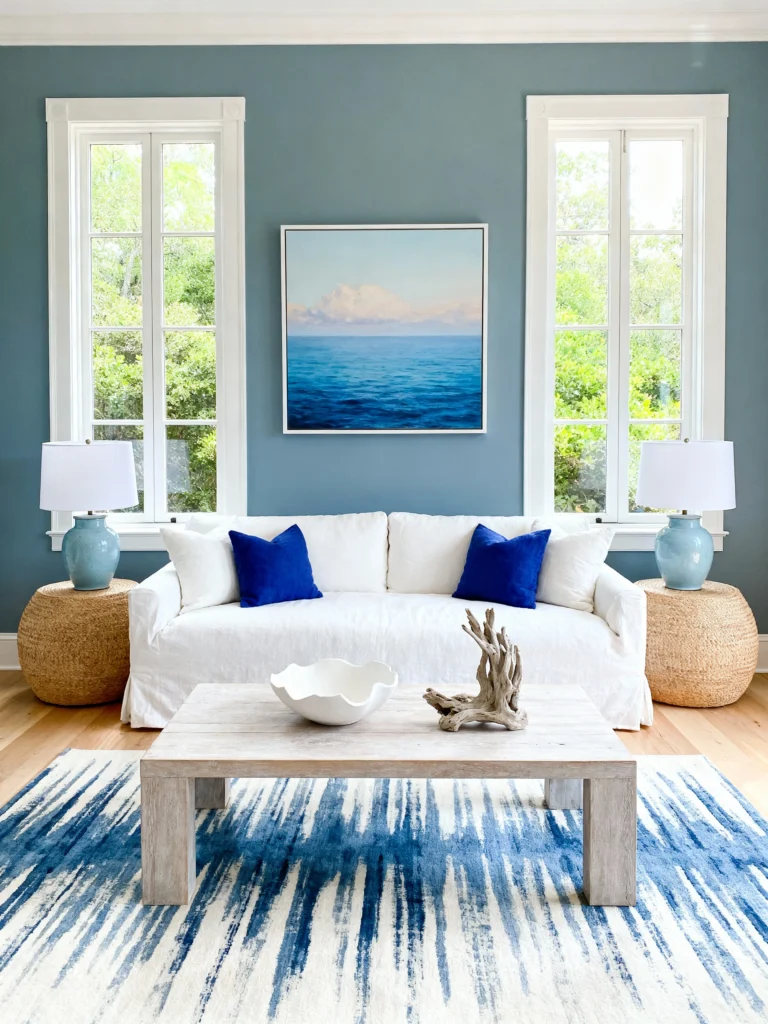 The rug is the real MVP here—those vertical watercolor streaks draw your eye inward and mimic the movement of the tide. And can we talk about those jute ottomans? Adding natural textures like dried grass or wood keeps a blue-and-white room from feeling too “stiff.” It’s sophisticated, sure, but it’s also a place where you’d actually feel comfortable putting your feet up with a book.