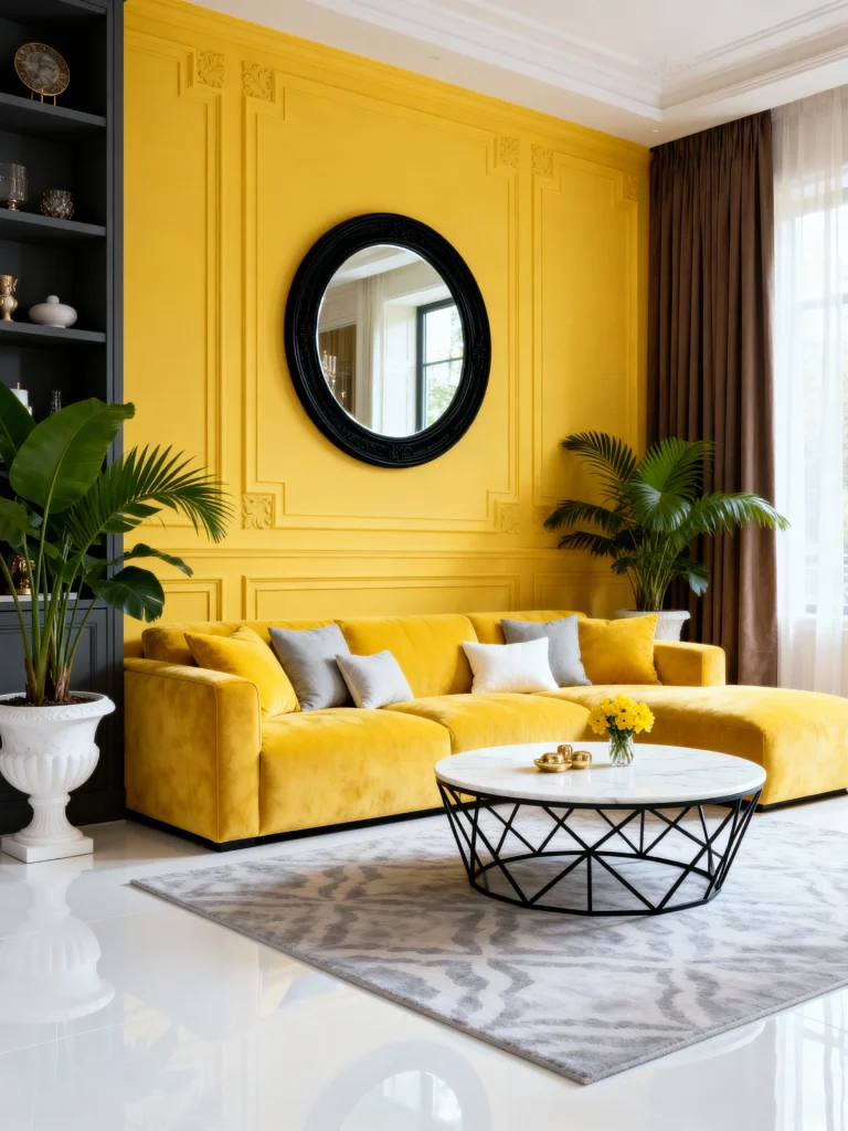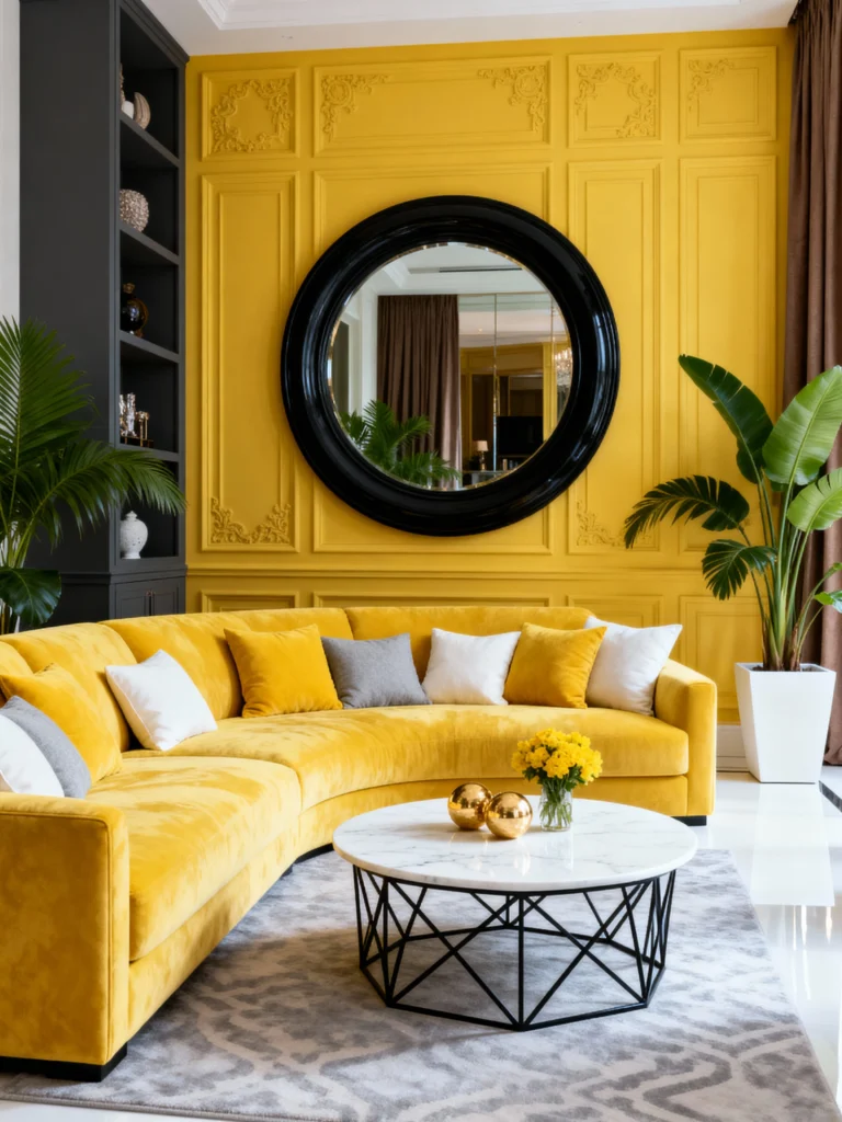 This is “maximalism” done right. The ornate wall molding and that huge, circular black mirror create a very “palace” vibe, but the bright yellow keeps it from feeling stuffy or old-fashioned.