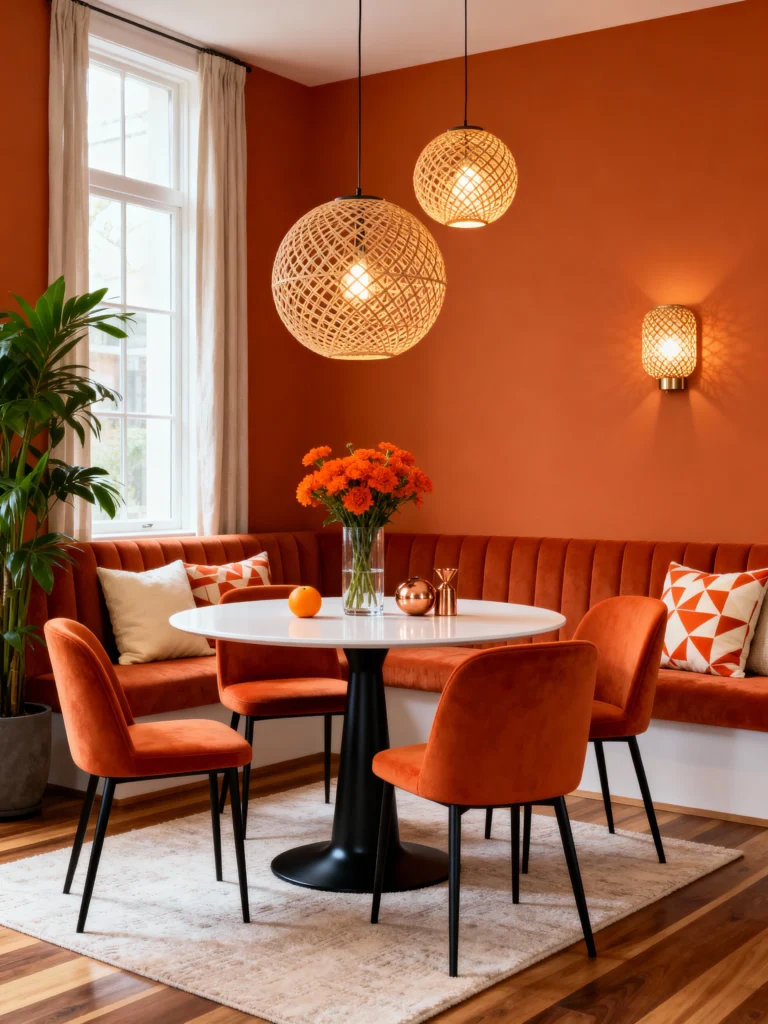 This dining nook feels like a warm hug. It’s a brave choice to go this heavy on orange, but it works because of the lighting. Those oversized wicker pendant lights cast such a soft, patterned glow that the burnt orange walls feel cozy rather than overwhelming.