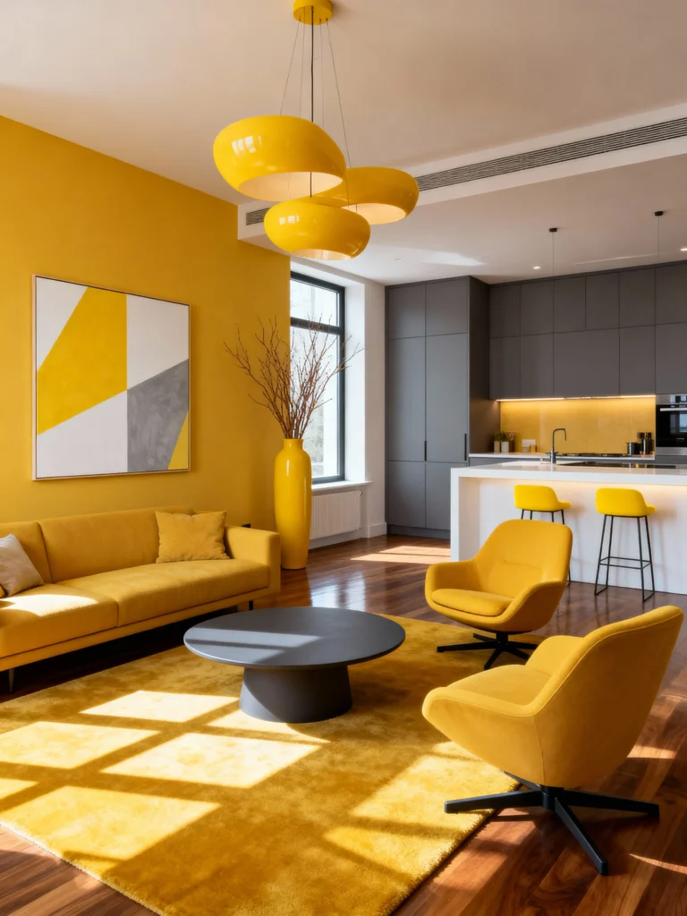 Welcome to the ultimate mood-booster! This open-concept living area is a masterclass in using yellow to define a space. By keeping the kitchen cabinets a sleek, matte charcoal, the yellow living area pops like a burst of sunshine.