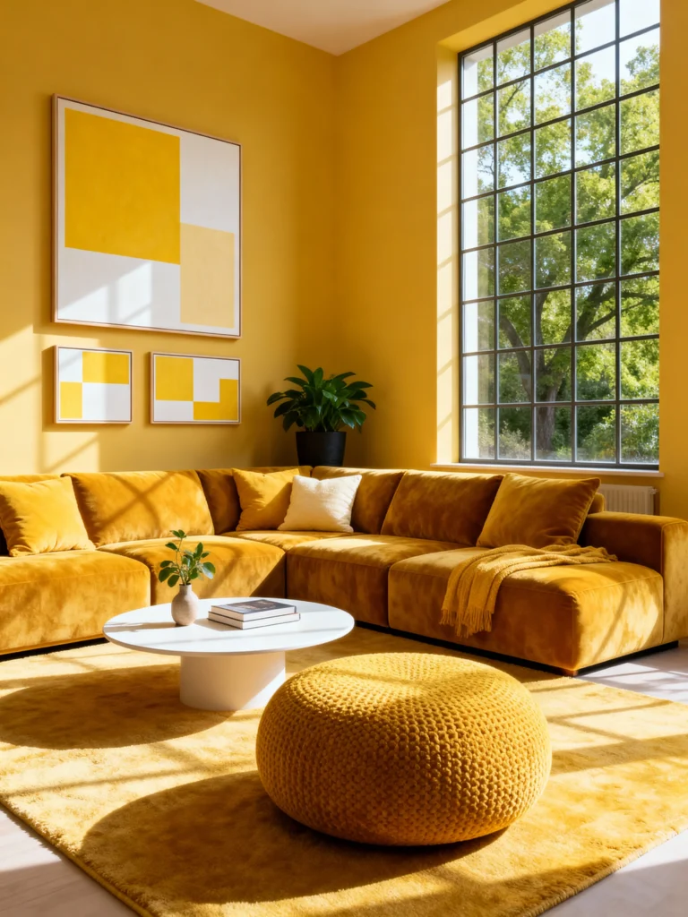 The addition of large tropical plants (like those Bird of Paradise leaves) is a fantastic way to contrast a bright warm wall. Green and yellow are neighbors on the color wheel, so they naturally look great together. It’s a lush, vibrant setup that feels like a tropical vacation indoors.