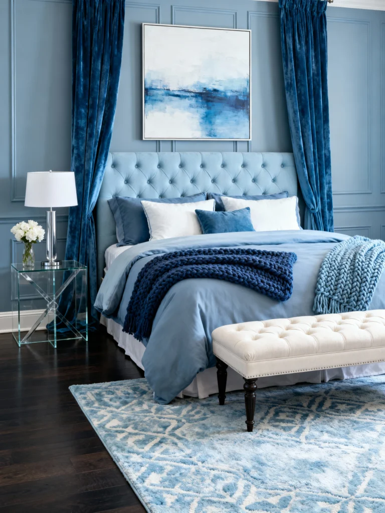 This bedroom is pure luxury. It takes the “Coastal Calm” vibe we saw earlier and turns the volume up to “Royal.” The floor-to-ceiling velvet drapes in that deep teal-blue create so much drama, especially against the classic wainscoting on the walls.
