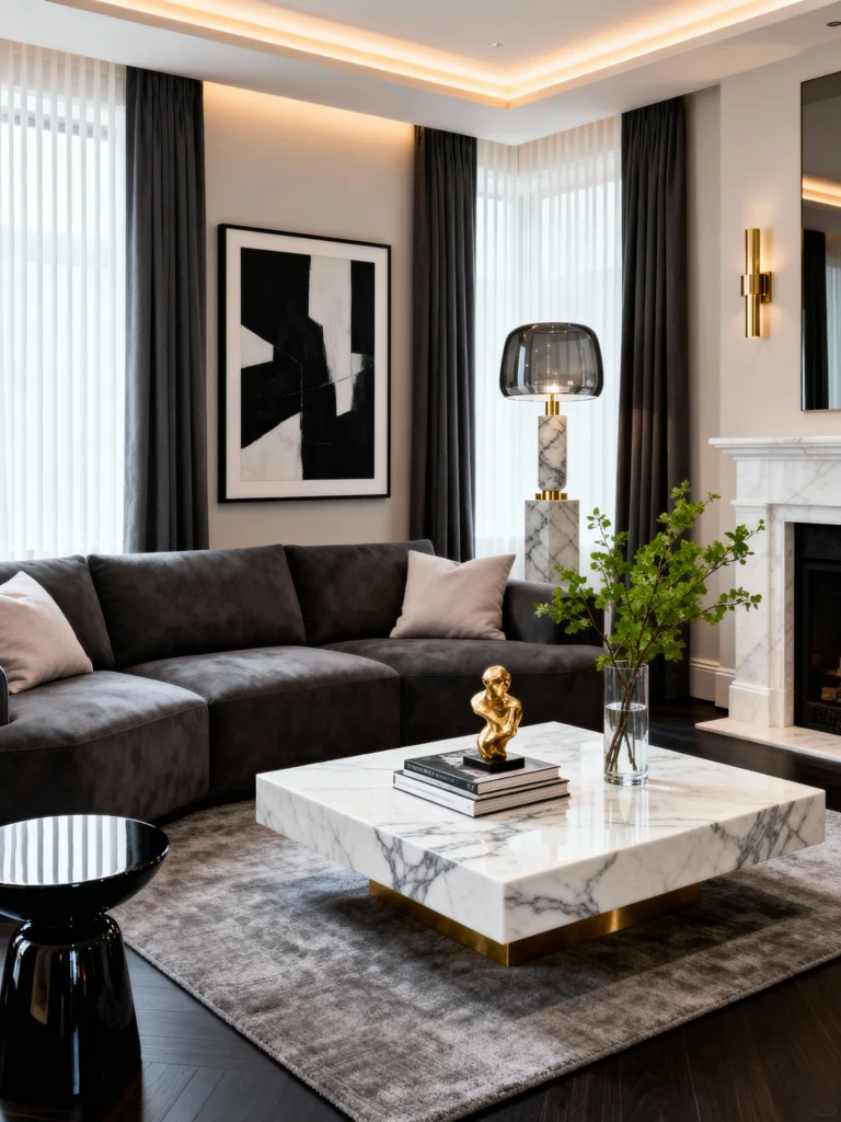 Let’s talk about “Quiet Luxury.” This room doesn’t need bright colors to show off. The palette is strictly black, white, and grey, but it feels incredibly expensive. The star here is that massive marble coffee table—it’s like a piece of functional art.