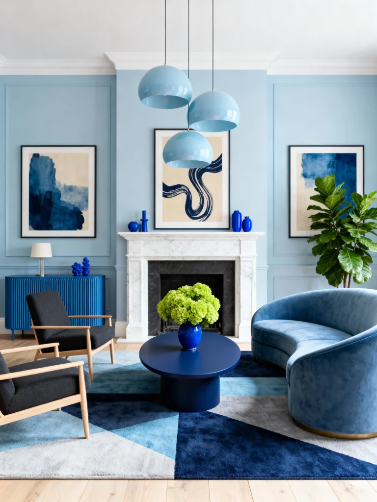 This is for the person who loves a bit of “Pop Art” energy. It’s a mix of classic architecture (look at that gorgeous white fireplace) and totally modern, vibrant furniture. The cobalt blue coffee table and the curved sofa are such fun, unexpected shapes.