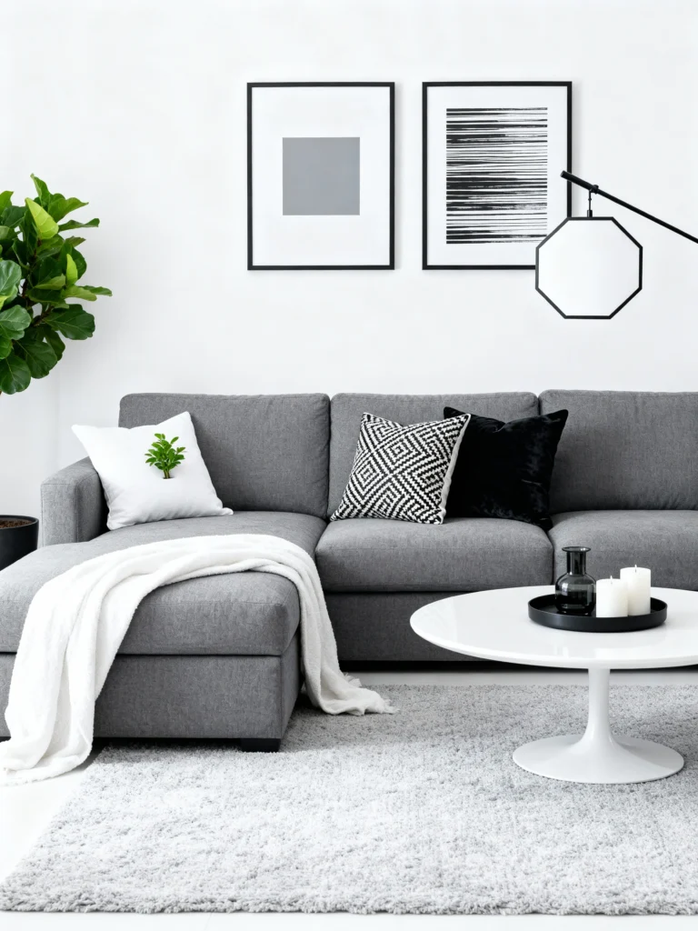 Sometimes, less really is more. This is the perfect inspiration for someone who loves a clean, organized aesthetic. The grey sectional is the ultimate neutral base, allowing those black-and-white graphic pillows to do the heavy lifting.