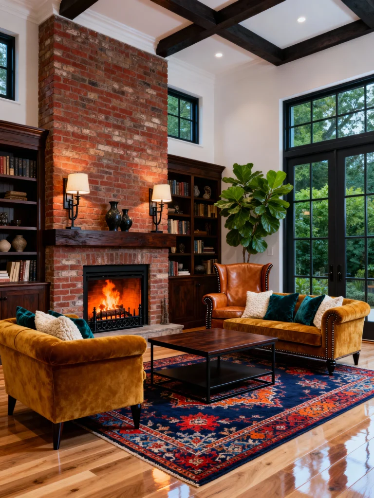 This room is giving me major “sophisticated professor” vibes in the best way possible. That floor-to-ceiling brickwork is such a bold statement, especially tucked between those dark wood built-ins. I love how the velvet mustard chairs pop against the deep blue rug—it’s a color palette that feels expensive but lived-in. If you have high ceilings and dark beams like this, lean into the drama!