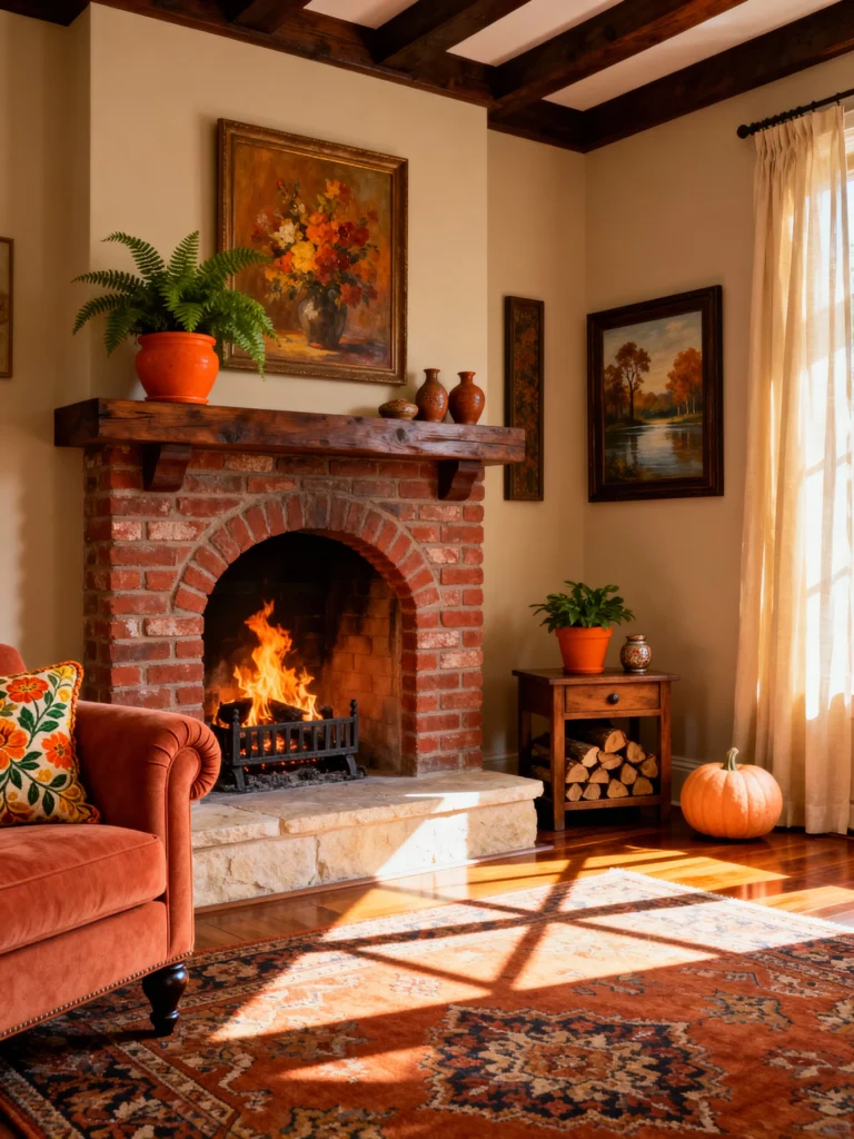 That chunky wooden mantel is incredible—it looks like a piece of history. I love how the golden hour sunlight is hitting the vases, making the whole room glow. The mix of the striped chair, the wicker stool, and the shag rug makes the space feel like it was collected over time rather than bought from a catalog.