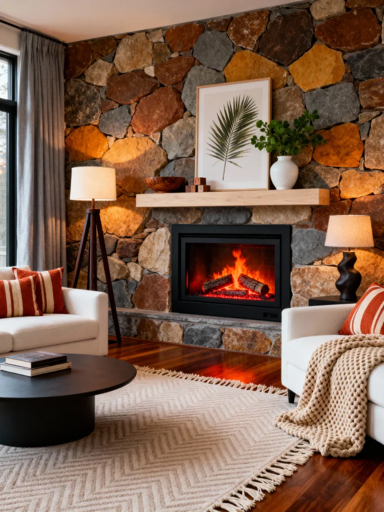 Can we talk about that stone wall? It is the absolute star of the show. When you have that much texture on the walls, you want to keep your furniture simple, like these white sofas. The chunky knit throw and the wooden tripod lamp bring in those “earthy” elements that make a modern space feel approachable and cozy.