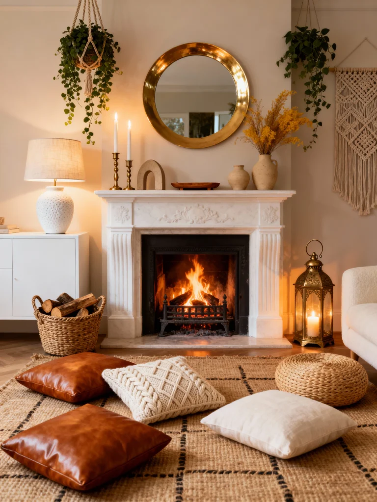 This is exactly where I want to be on a Sunday afternoon. Forget the chairs—let’s just hang out on the floor with those leather floor pillows! The round gold mirror and the hanging plants give this a really relaxed, bohemian energy. It’s a great example of how to make a formal white mantel feel casual and fun.