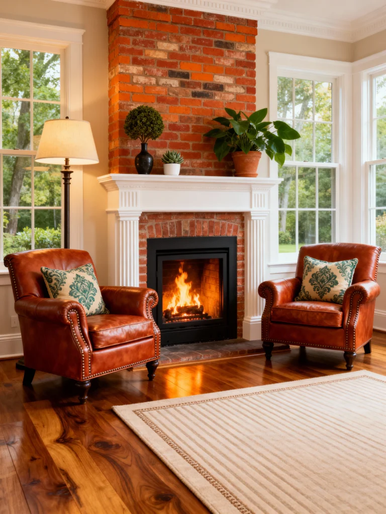 You can never go wrong with a pair of cognac leather armchairs. They just scream “classic.” This setup is perfect for a smaller nook; it’s symmetrical, inviting, and makes the fireplace the undisputed focal point. The green patterned pillows are the perfect “pop” against the warm wood floors and red brick.