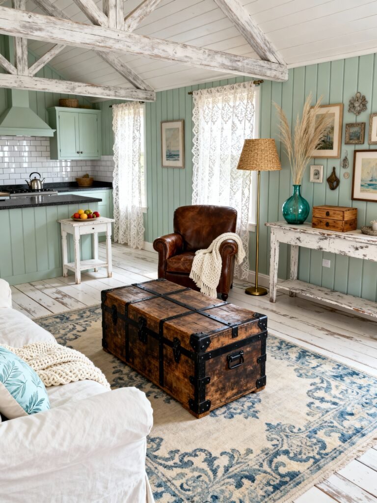 The mix of styles here is so interesting—you’ve got a vintage-style leather armchair, a rustic trunk used as a coffee table, and delicate lace curtains. It feels very “shabby chic meets the seaside.” It’s cozy, eclectic, and full of personality.