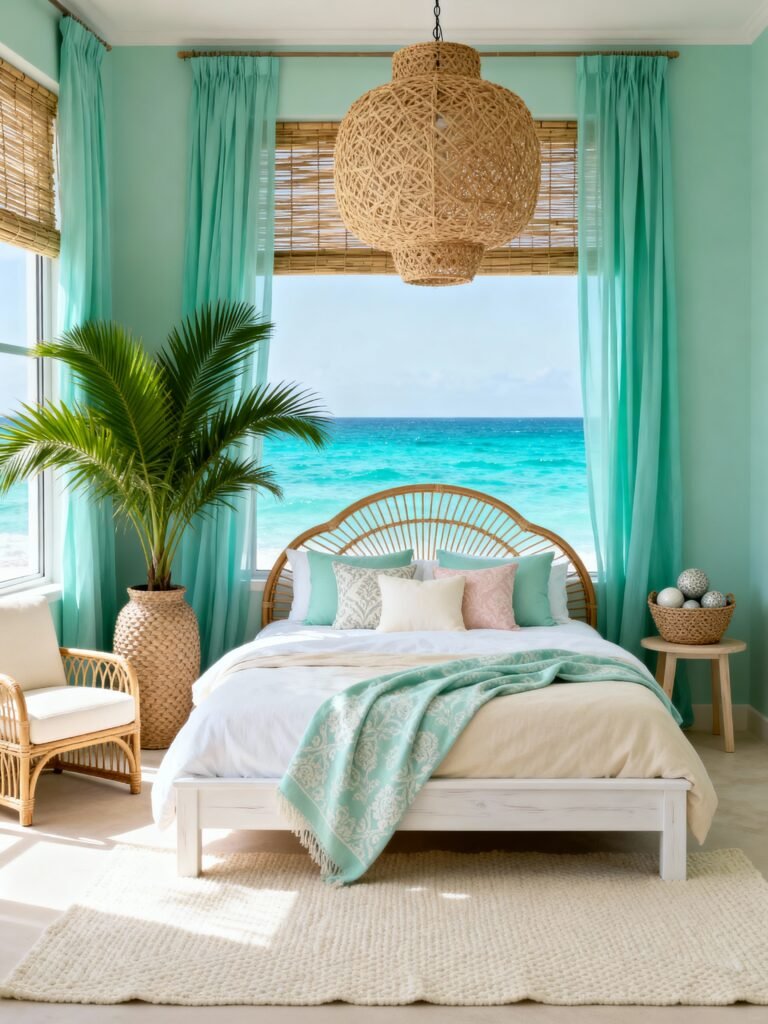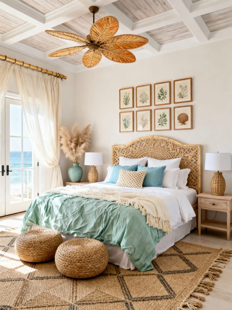 The rattan headboard and the jute rug bring in so much warmth, while the soft sage and teal bedding keep things cool and airy. Those little woven ottomans at the foot of the bed are such a practical touch, too. It’s the kind of room where you’d wake up feeling like you’re on vacation every single morning.