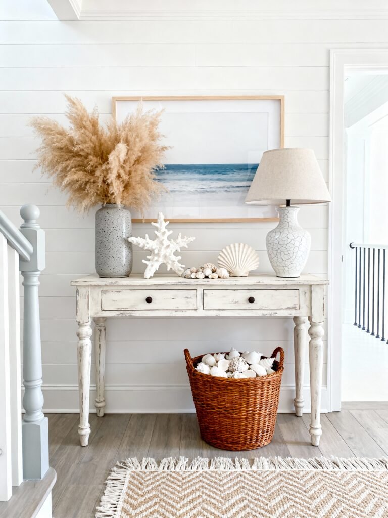 The distressed white console table is the perfect stage for more beachy treasures, like the pampas grass and the starfish. It creates such a welcoming, serene first impression for anyone walking through the front door.