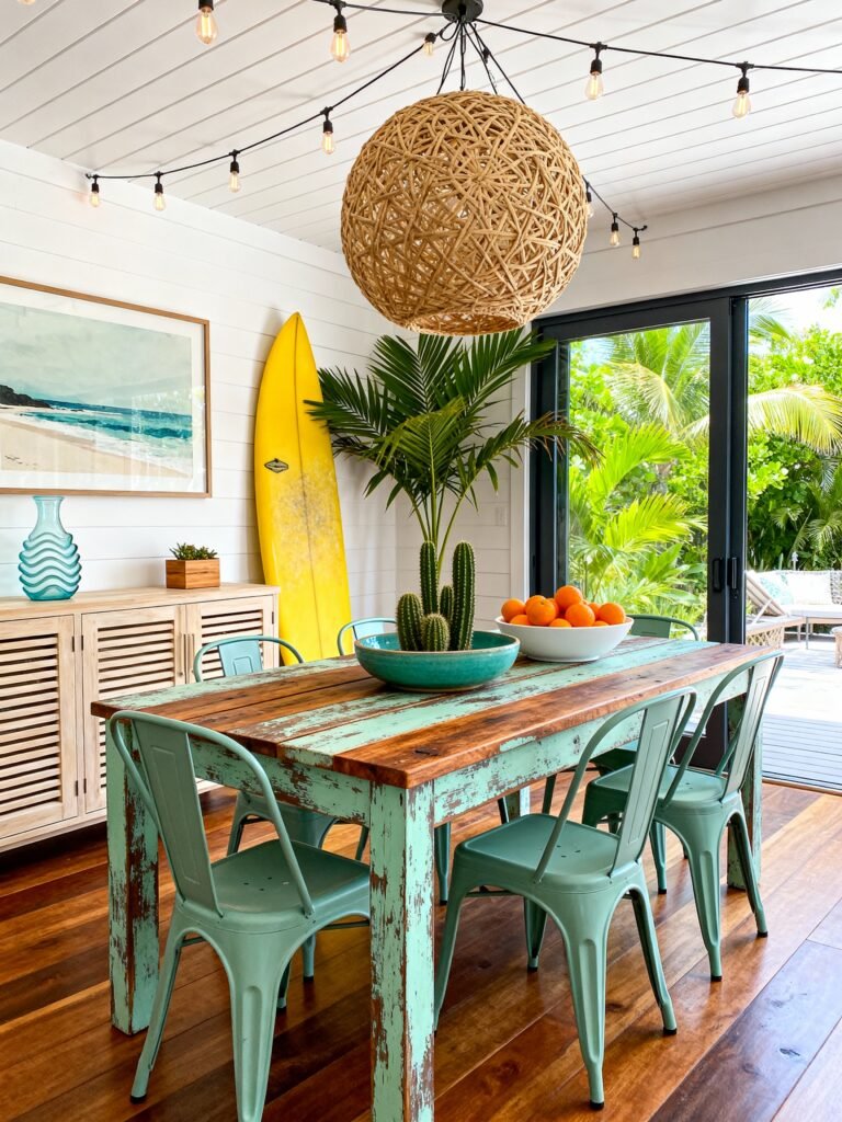 Can we just talk about the vibe in this dining room? It is the perfect mix of “cool surfer” and “chic host.” That bright yellow surfboard leaning in the corner is such a genius way to add a pop of color without needing a single drop of paint.