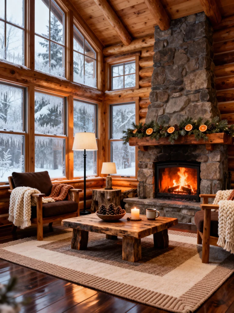 Is there anything better than watching a snowstorm from the safety of a warm living room? This space is the definition of “cozy.” The floor-to-ceiling windows act like a live painting of a winter wonderland, but the real star is that massive stone fireplace. I love how the chunky knit throws and the orange-slice garland give it such a personal, handcrafted touch. It feels like the kind of place where you’d spend all afternoon with a giant mug of cocoa and a good book.