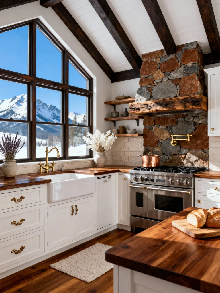 This is a slightly different angle of a similar kitchen, and you can really see the detail in the stonework here. The contrast between the crisp white cabinetry and the dark, heavy ceiling beams is just stunning. It’s a great example of how you can use “old world” materials like stone and timber in a way that still feels organized and bright.