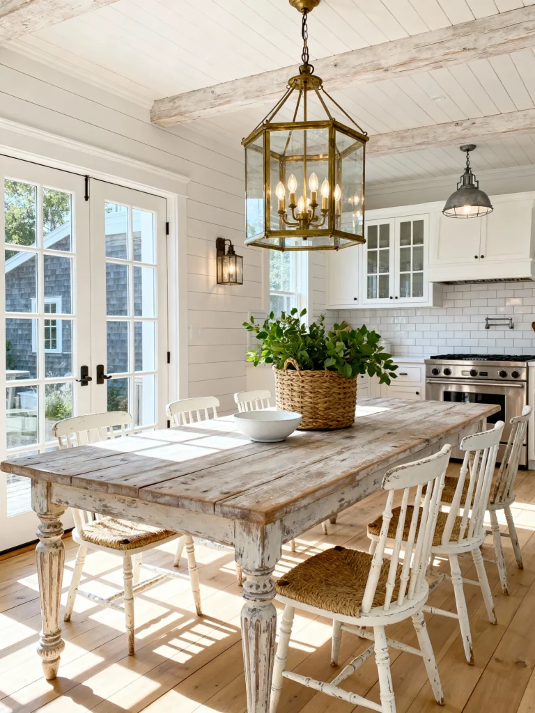 We’re ending with a bit of a twist! This space leans more “Coastal Farmhouse” than “Mountain Lodge.” The white shiplap walls and the weathered, white-washed dining table make everything feel so sun-drenched and breezy. That oversized brass lantern over the table is a total showstopper. It’s a reminder that “rustic” doesn’t always have to be dark and heavy—it can be light, bright, and elegant too.