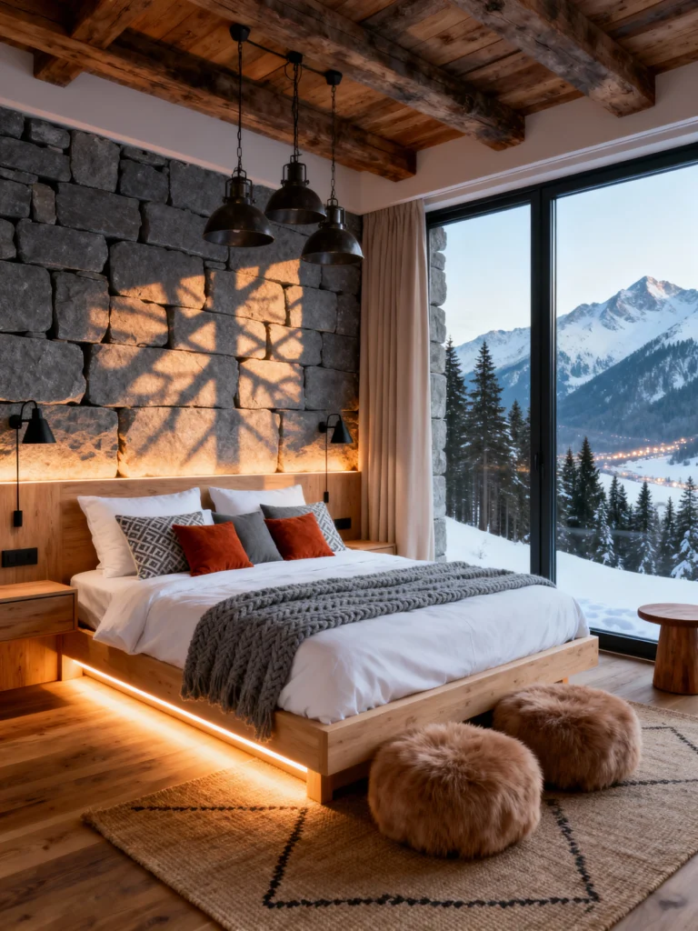 This bedroom is a masterclass in texture. You’ve got the rough-cut stone wall meeting the sleek, modern glass of the balcony door. The under-bed lighting is a total game-changer—it makes the bed look like it’s floating and adds a soft, warm glow that’s much more relaxing than harsh overhead lights. Imagine waking up to that mountain view while still tucked under a heavy wool blanket. It’s basically a five-star resort suite in the middle of the woods.