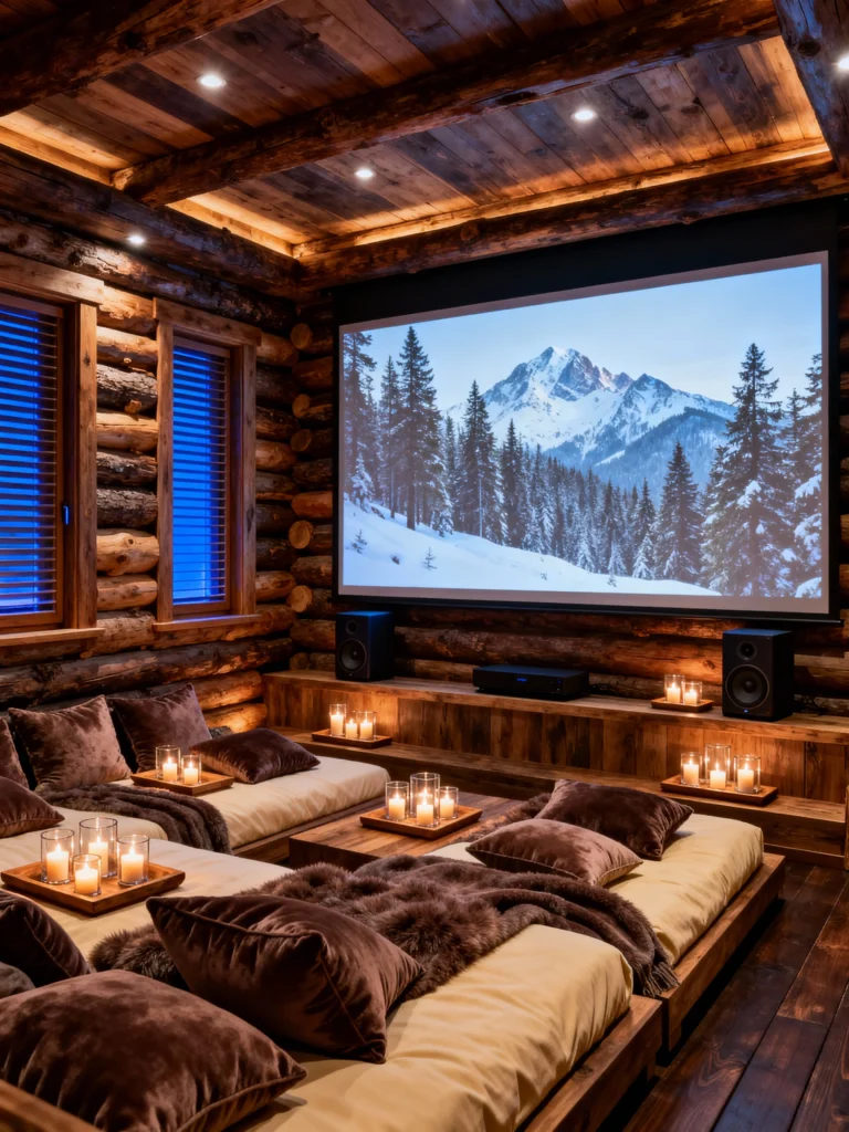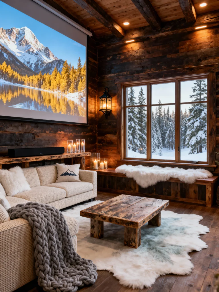 This isn’t your average basement media room. By putting a projector screen against dark, reclaimed wood walls, they’ve created a “lodge-style” theater. Those faux-fur rugs look so soft you’d probably end up falling asleep on the floor before the movie even ends! I really dig the candle lanterns scattered around; they add a flicker of light that doesn’t wash out the screen but keeps the room feeling intimate and warm.