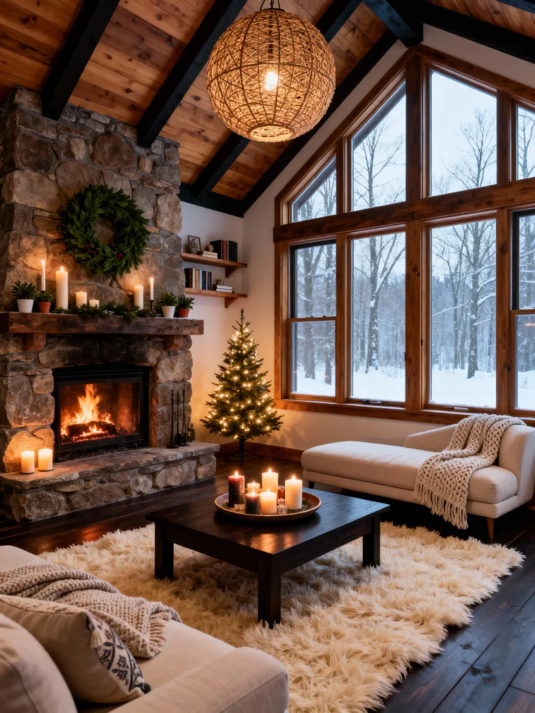 This room feels like a warm hug. The mix of a traditional stone fireplace with that giant, orb-like wicker pendant light is such a cool design choice. It blends “boho” vibes with classic “cabin” style. The abundance of candles on the coffee table creates such a peaceful atmosphere as the sun goes down over the snowy forest. This is exactly where I’d want to be on Christmas Eve.