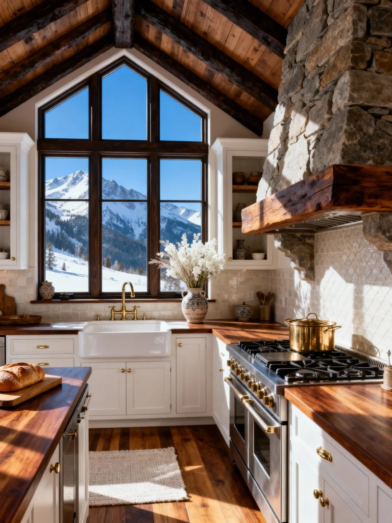 I think I’d actually enjoy washing dishes if I had this view! This kitchen strikes a perfect balance between “farmhouse” (that deep apron-front sink) and “luxury” (those gorgeous wood countertops and brass fixtures). The stone range hood is such a bold, architectural statement. It feels professional enough for a chef but cozy enough for a family breakfast.