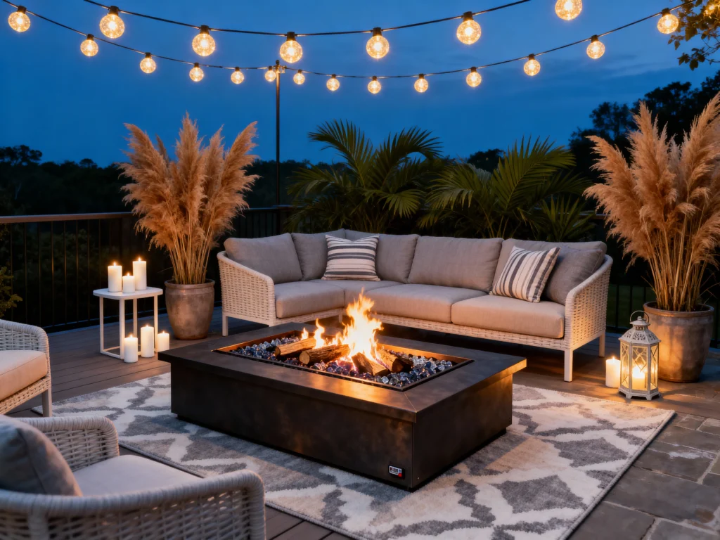 This modern rooftop or deck lounge offers a sophisticated vibe. The low-profile, rectangular gas fire pit is sleek and contemporary, surrounded by comfortable, woven gray sectional seating and white wicker chairs. The whole area is warmly lit by numerous string lights, creating an overhead canopy of soft glow. Potted pampas grass and palm-like plants add a touch of texture and height, framing the seating area and making it feel like an elevated, stylish outdoor living room.