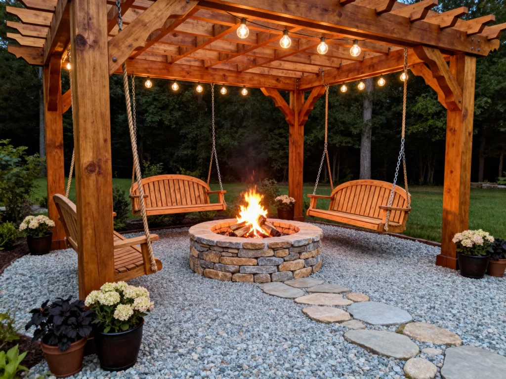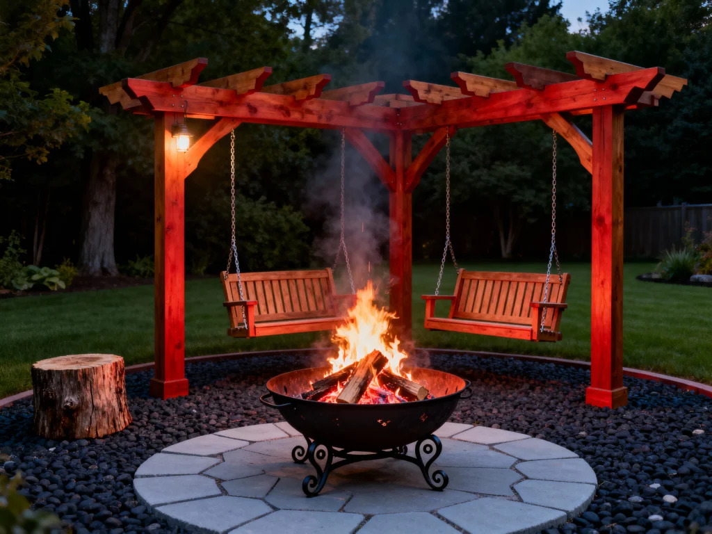 Talk about making a statement! The red-stained pergola is the clear star here, dramatically highlighting the two wooden porch swings hung from it. Below, a classic black wrought-iron fire bowl sits on a circular patio of light stone, ringed by dark, polished river stones. This design is all about bold color and texture contrast against the green lawn, creating a high-impact, memorable fire pit area that’s both dramatic and inviting.