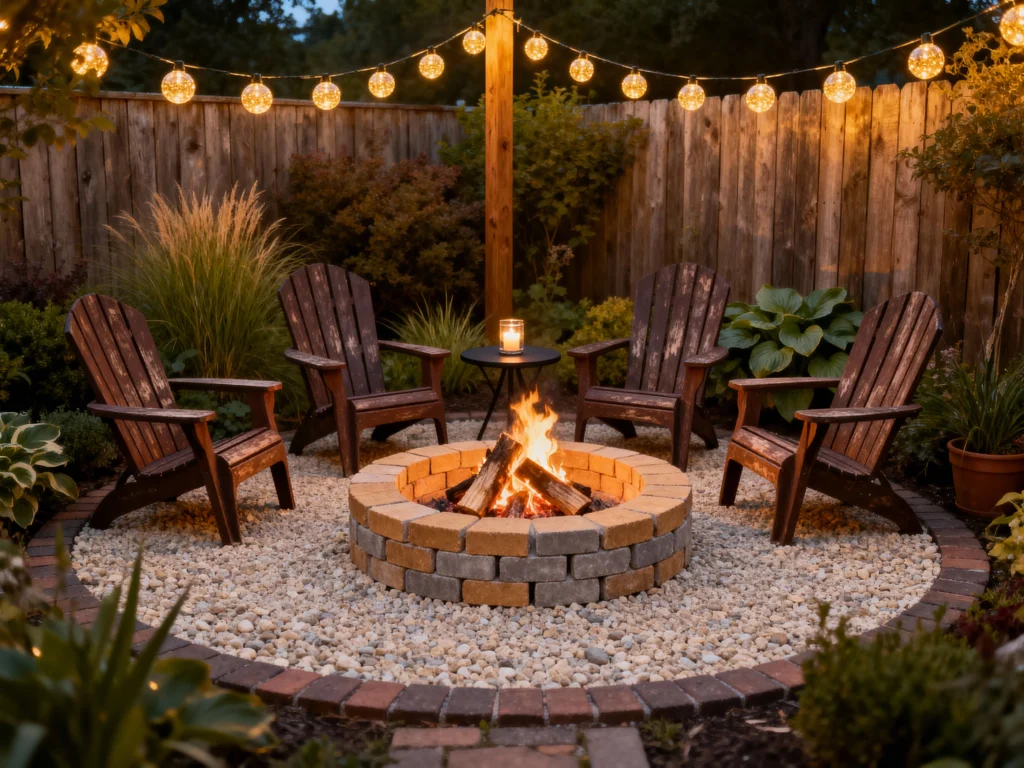 This setup is the definition of classic backyard charm! Four dark wood Adirondack chairs are perfectly spaced around a traditional, stacked stone fire pit, built with mixed-colored pavers. The ground is covered in light gravel, bordered by a darker brick edge, adding a neat, manicured feel. Simple string lights overhead and the natural wood fence provide a warm, intimate backdrop, making it an ideal spot for enjoying a simple, rustic bonfire with friends.