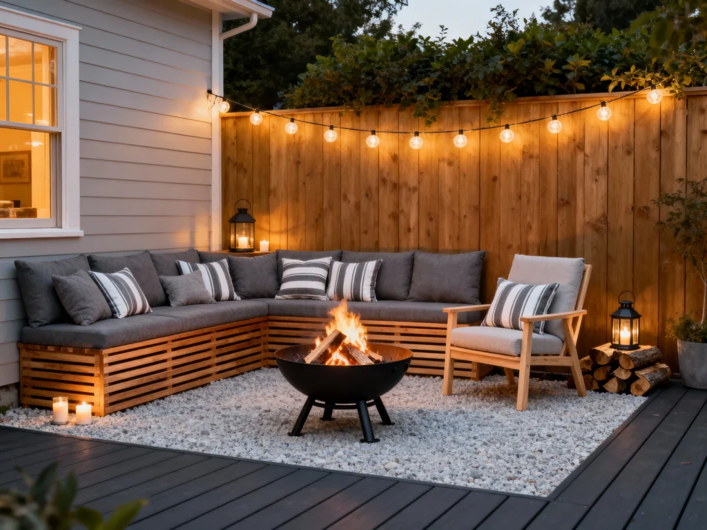 This modern patio space uses clean lines and contrast beautifully. A sleek, slatted wood sectional bench, topped with plush dark gray cushions, wraps around a cozy area of white gravel. The fire is contained in a stylish black metal bowl on legs, keeping it simple and elevated. Dark decking, a light wood fence, and string lights complete the look, making this a perfect small-space solution that blends natural materials with a contemporary aesthetic.