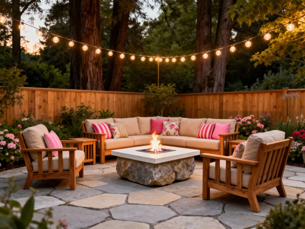 This is pure patio luxury! A large, plush sectional sofa and two armchairs, all featuring sturdy wooden frames and light cushions, surround a stunning square fire pit with a rough-hewn stone base and a smooth top. The flooring is natural, irregular flagstone, giving it a classic, high-end feel. Surrounded by a wooden fence and lush greenery, it’s a wonderfully balanced and comfortable space for outdoor entertaining.
