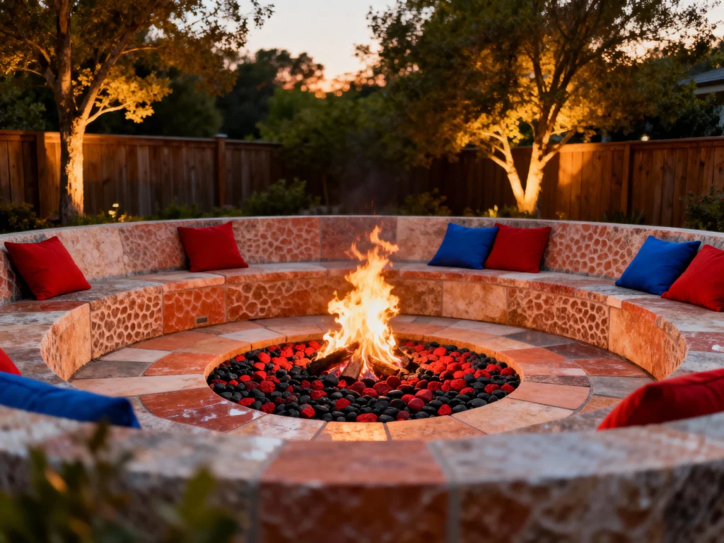 This is a seriously striking, custom-built space! The circular seating area is made of beautifully textured, colorful stone and terracotta-toned tiles, creating a bold, architectural statement. The fire pit itself is sunken, surrounded by unique black and red stones, adding dramatic visual flair. The bright red and blue throw pillows pop against the neutral stone, inviting you to sit and enjoy a truly unique and vibrant outdoor gathering spot.