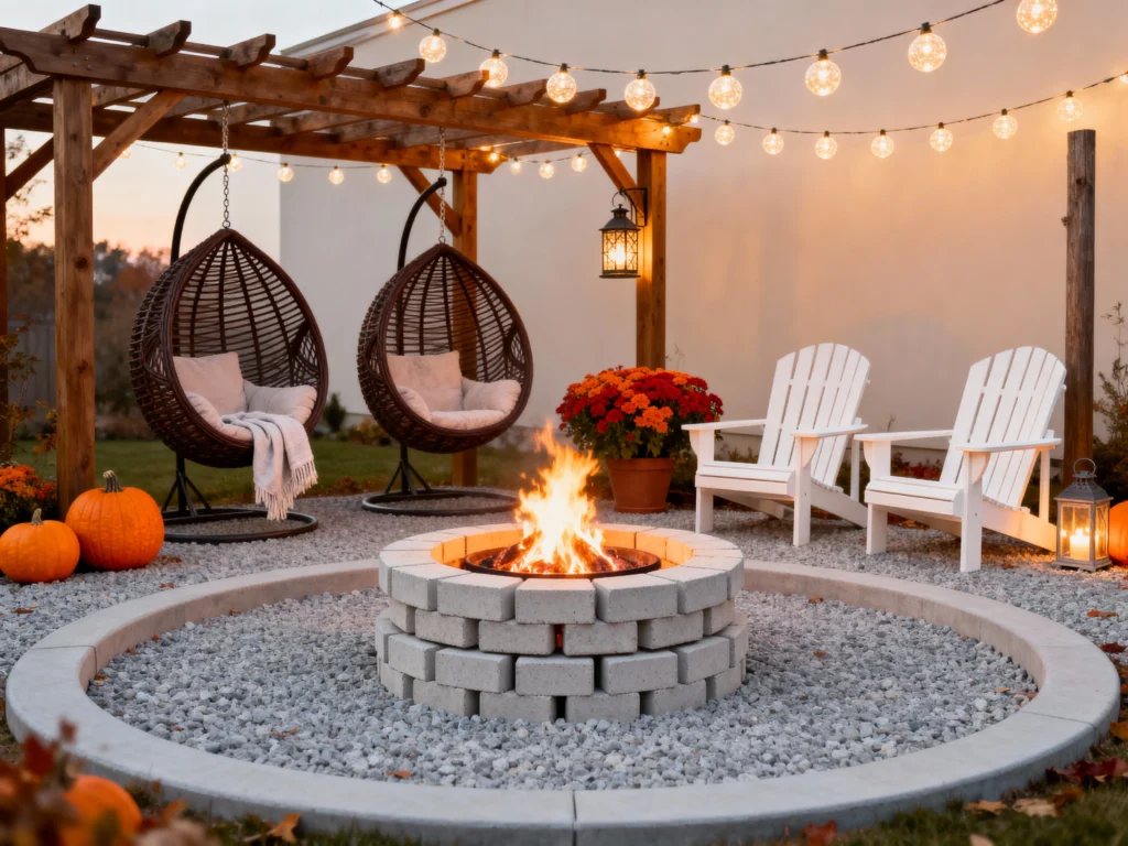 This gorgeous setup is ready for autumn gatherings! It features a chunky, light-colored block fire pit at the center of a crisp, white gravel circle. The seating is a fun mix: two relaxing, dark wicker hanging egg chairs under a rustic pergola, balanced by two classic white Adirondack chairs. The warm sunset lighting, decorative pumpkins, and vibrant orange mums add beautiful, welcoming seasonal touches, proving that comfort can be stylishly paired with fun.