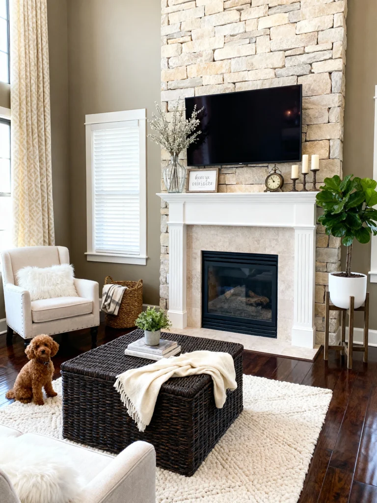 If you love a mix of “stately” and “approachable,” this is it. The floor-to-ceiling dry-stack stone adds so much height to the room, making it feel grand but still grounded. I love how the crisp white mantel pops against the earthy stones—it’s the perfect spot for a few candles and a classic clock. Plus, having the TV mounted right there makes it the ultimate spot to binge-watch your favorite show while the dog curls up on that plush rug. It feels lived-in but totally polished.